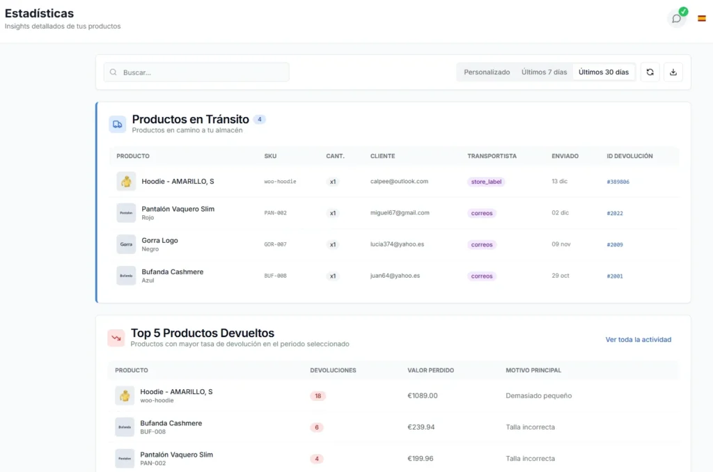 - Ranking automático de productos con más devoluciones, filtrable por período y motivo.