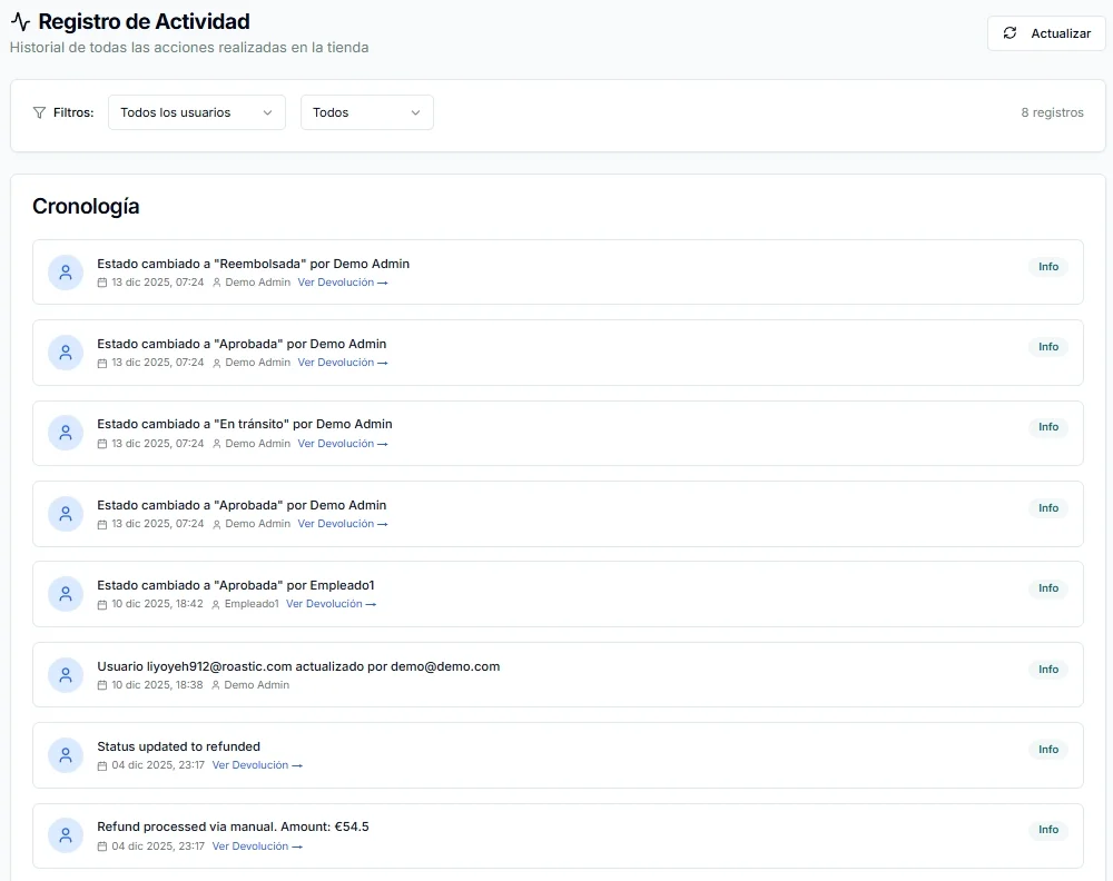 Cada acción realizada en ReturnsUp queda registrada automáticamente en WooCommerce, manteniendo el historial del pedido siempre coherente.
